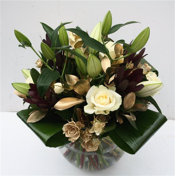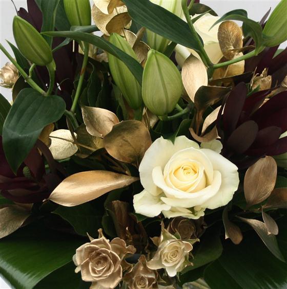 A highly scented cream, gold and dark red festive hand-tied with white roses, oriental lilies and gilt foliage.