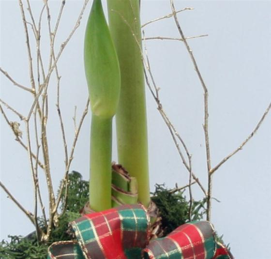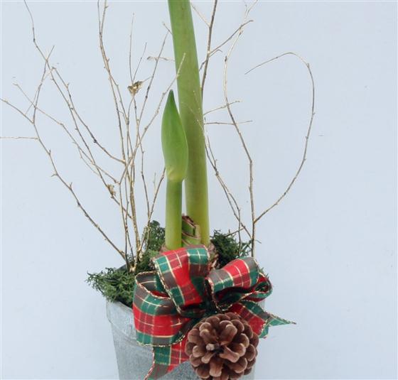 A rustic metal pot including Amaryllis plant finished with a tartan ribbon and gold twigs.