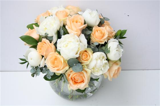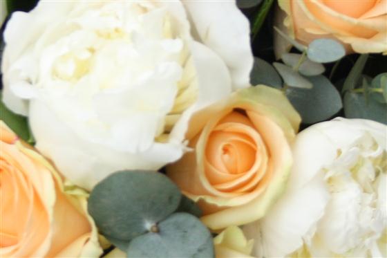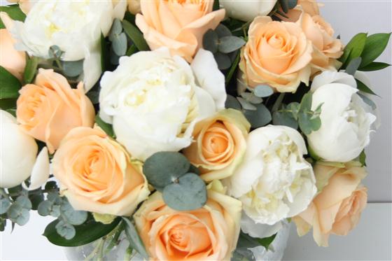 A simple, but beautiful bouquet of white peonies and peach roses. Vase not included.