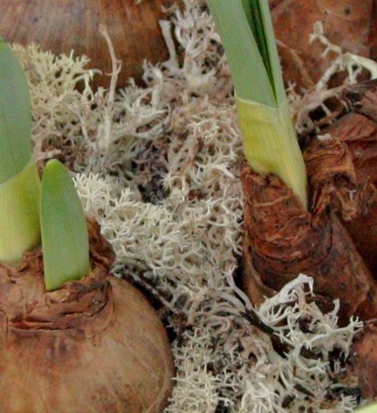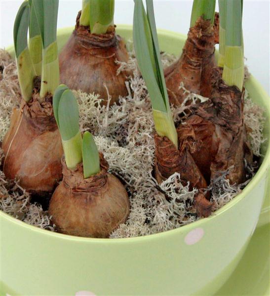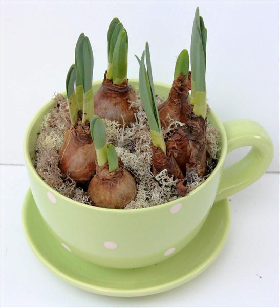 A lime green tea cup filled with daffodil bulbs and finished with moss.