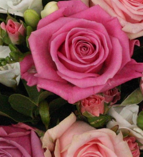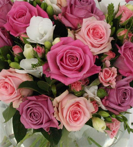 An abundance of multi tonal pink roses combined with highly scented white freesias. A fragrant delight. Vase not included.