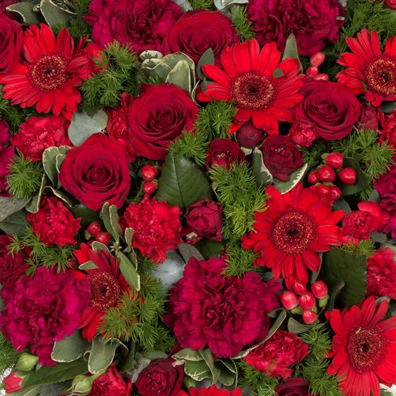 This striking red heart is created using a combination of seasonal foliage, hypericum berries and all red blooms.