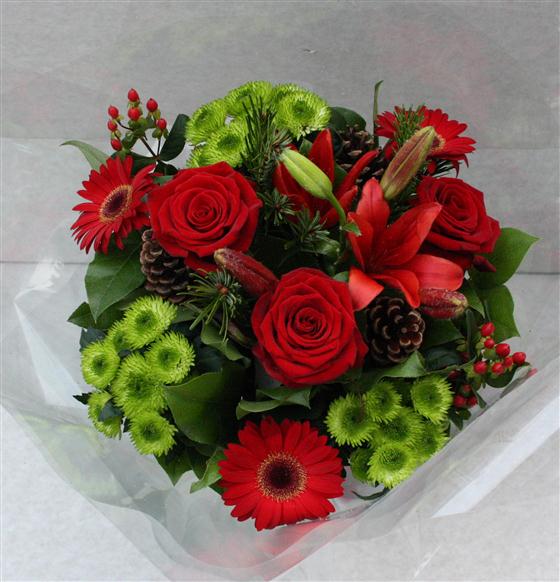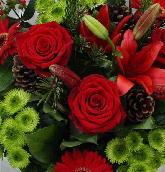 Includes Grand Prix roses, red germini, red lily, green chrysanths, red hypericum and natural cones to finish.