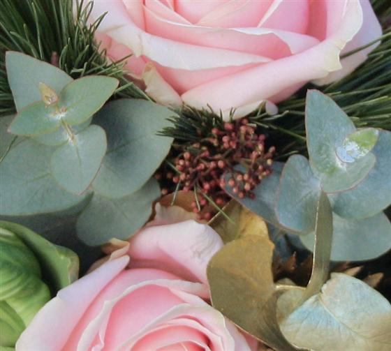 A muted deep red and pastel pink Christmas hand-tied bouquet including six long stemmed pink roses and gold highlights.