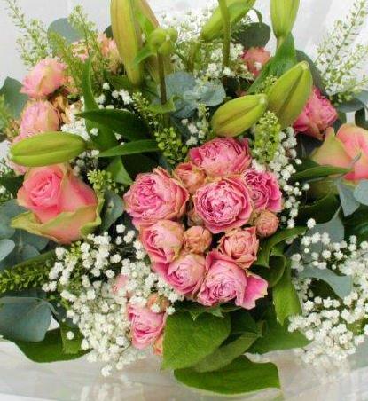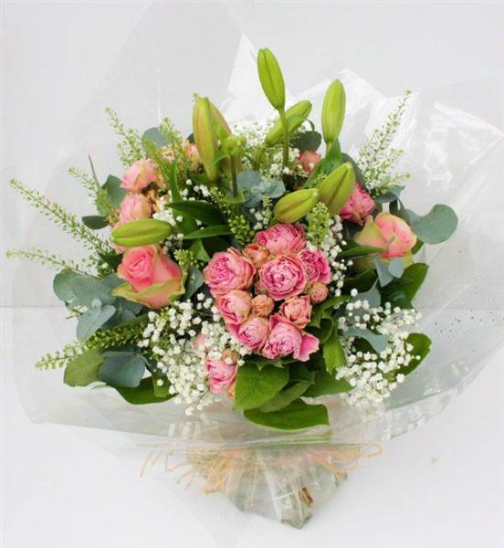 A pretty and delicate, feminine hand-tied of pink spray roses, lilies and gypsophila.