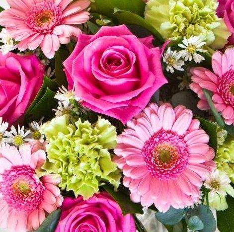 Aqua pink roses, pastel pink gerberas and pale green carnations mingled with deep green foliage. A popular bouquet suitable for any occasion.