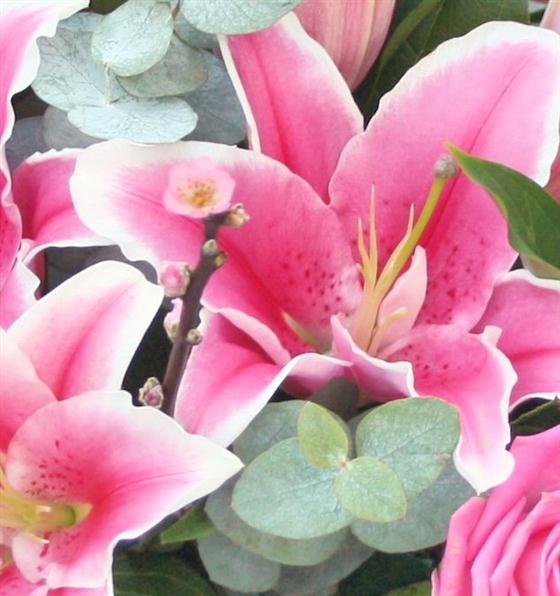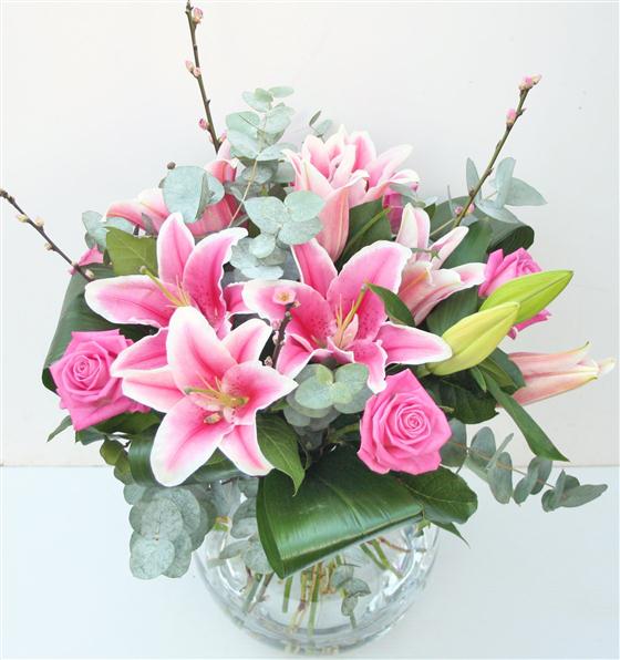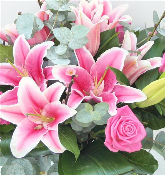 A beautiful bouquet that includes large pink oriental lily's and pink roses finished with pink cherry blossom and eucalyptus. Vase not included.