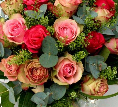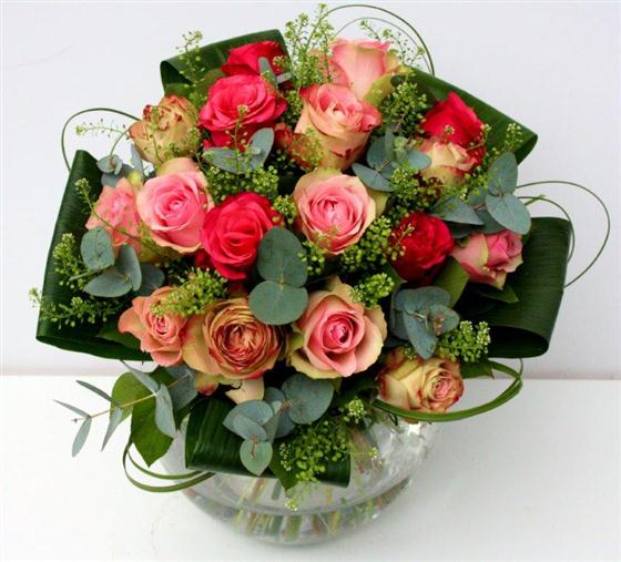A contemporary style bouquet of pink roses in an array of shades with bold aspidistra leaves and eucalyptus. Vase not included.