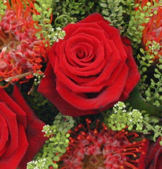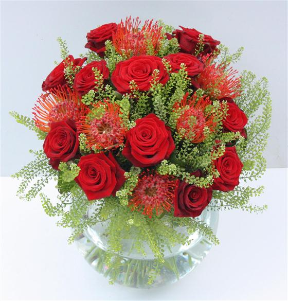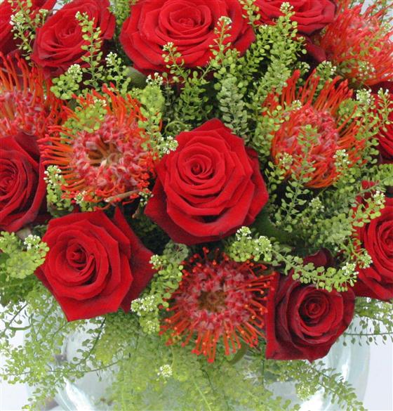 An exotic bouquet of proteas and a dozen velvety red roses interspersed with delicate foliage.vase not included.