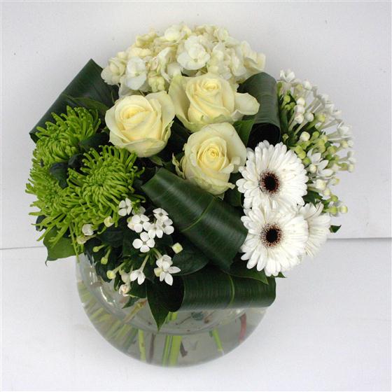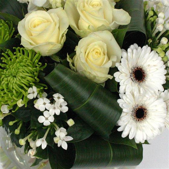 A modern array of white and lime blooms arranged as a sectional hand-tied bouquet, including roses, hydrangea and gerberas. Vase not included.