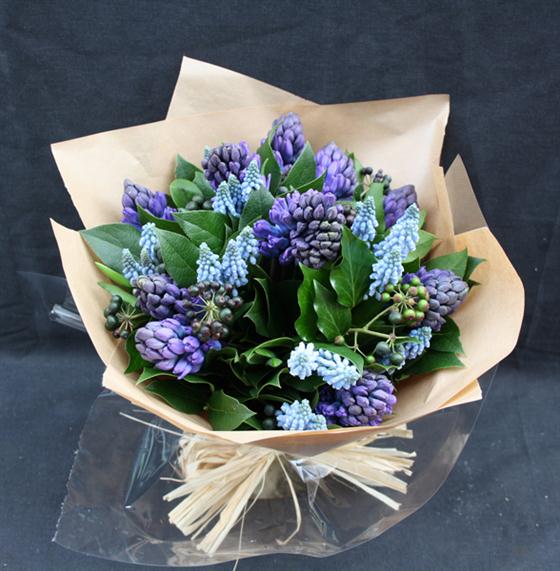 Scented hyacinth and mixed foliage make up this wonderful springtime design.