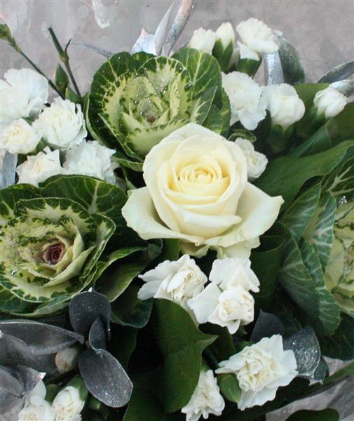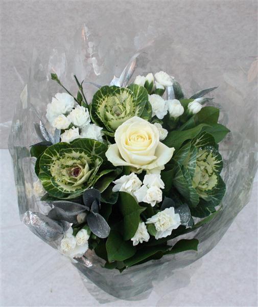 A lovely white bouquet that brings seasons greetings to all. Includes Avalanche rose, white cabbage flowers, white spray carnations and silver ruscus.