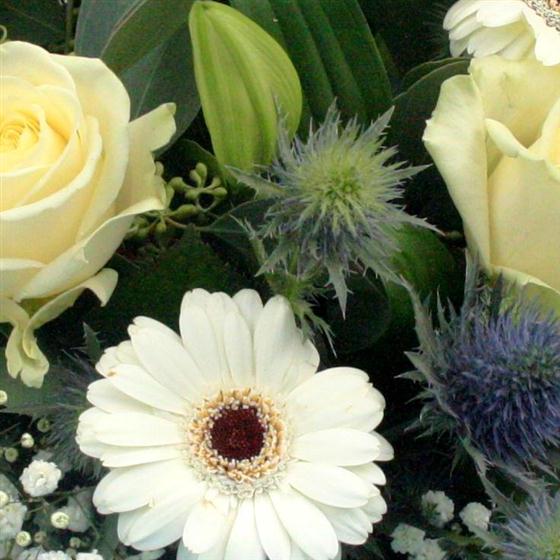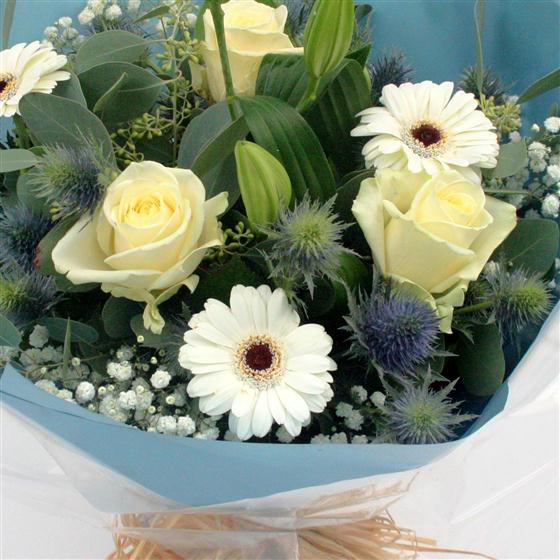White roses, oriental lilies, gerberas and thistle create this muted bouquet suitable for any occasion.