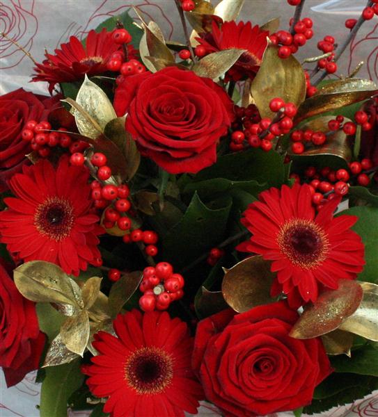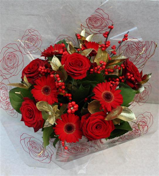 A Christmas classic with red roses, red gerberas and ilex berries combined with stunning gold foliage.